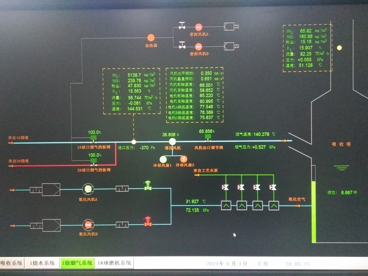 攀藍(lán)鼎一號(hào)燒結(jié)脫硫業(yè)主為攀枝花鋼鐵集團(tuán),其采用BOO模式,攀鋼集團(tuán)燒結(jié)面積為360m2,煙氣量1000000Nm3/h,入口SO2濃度6000mg/Nm3,顆粒物濃度60-80mg/Nm3左右,NOX濃度300mg/Nm3左右。經(jīng)一號(hào)燒結(jié)脫硫系統(tǒng)脫硫后出口SO2濃度在100mg/Nm3以下,顆粒物濃度在50mg/Nm3以下,NOX濃度在300mg/Nm3左右,其脫硫效率達(dá)到98%以上,脫硫煙氣含量等各項(xiàng)指標(biāo)均達(dá)到了國(guó)家標(biāo)準(zhǔn)排放要求,并穩(wěn)定運(yùn)行。同時(shí)藍(lán)鼎環(huán)保還在繼續(xù)深入研究使脫硫煙氣含量降低的技術(shù)。