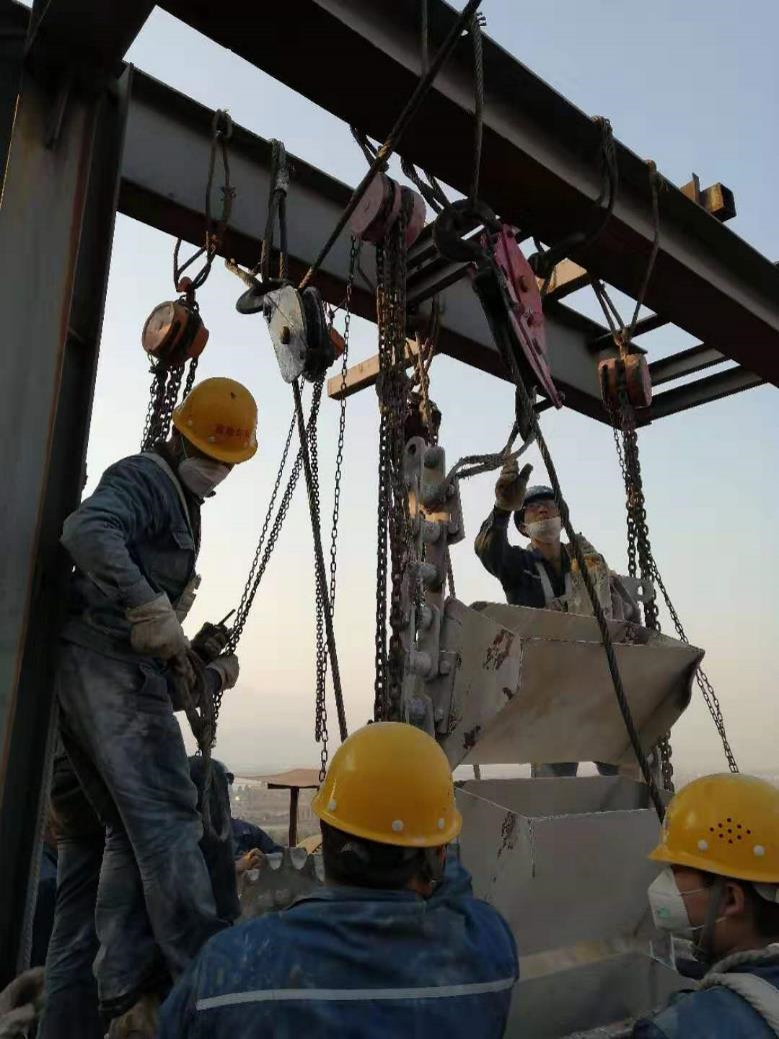 剛完成A2斗提鏈條的大修,A4鏈條又出現(xiàn)新問題。19日凌晨04:10分A4斗提鏈條突然斷裂,檢修班長王成東立刻帶領(lǐng)人員到現(xiàn)場處理設(shè)備故障,經(jīng)現(xiàn)場檢查發(fā)現(xiàn)50米高的斗提鏈條全部掉到斗提箱體的中部,需要將兩側(cè)斗提鏈條吊至50高的頭輪上,再進行對接。如果采用兩臺250噸的吊車,將花費至少3萬元的費用,通過大家的討論,最終采用兩臺10噸卷揚機加4臺5噸的手拉葫蘆吊裝斗提鏈條,成功的將斗提鏈條吊至50米高的頭輪上。