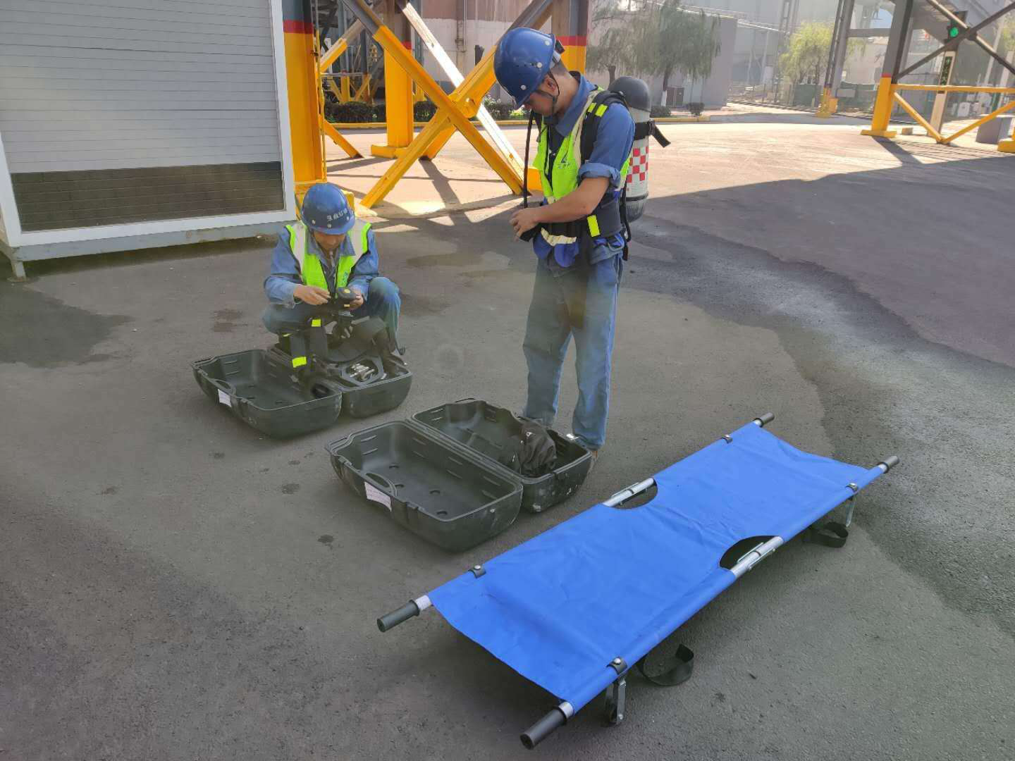 本次演練背景是200現(xiàn)場巡檢發(fā)現(xiàn)熱風(fēng)爐區(qū)域煤氣濃度達(dá)到300PPM,發(fā)生人員中毒,并匯報中控、班長,中控立即匯報鐵廠調(diào)度,班長到現(xiàn)場檢查設(shè)備情況并協(xié)調(diào)處理,并將情況匯報生產(chǎn)部部長,班長通知現(xiàn)場操作人員立即將空氣呼吸器和急救物資拿到現(xiàn)場,同時安排人員疏散周邊人員,并做好周邊區(qū)域警戒。