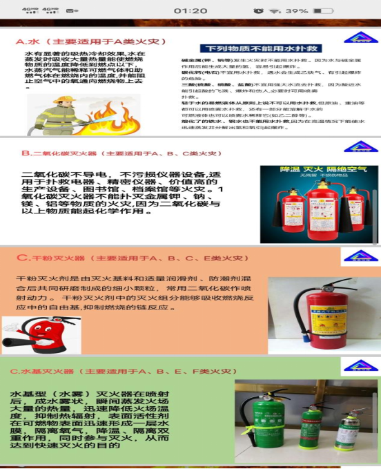 消防知識(shí)則從了解燃燒的基本條件,到滅火的幾種方法:冷卻法、隔離法、窒息法、抑制法,滅火器材的使用,放置地點(diǎn),詳細(xì)的講述了應(yīng)對(duì)火災(zāi)的“四會(huì)”:會(huì)報(bào)警、會(huì)使用消防器材、會(huì)組織人員疏散逃生、會(huì)撲救初期火災(zāi)。四懂:懂本崗位的火災(zāi)危險(xiǎn)性、懂預(yù)防火災(zāi)的措施、懂滅火方法、懂逃生方法。