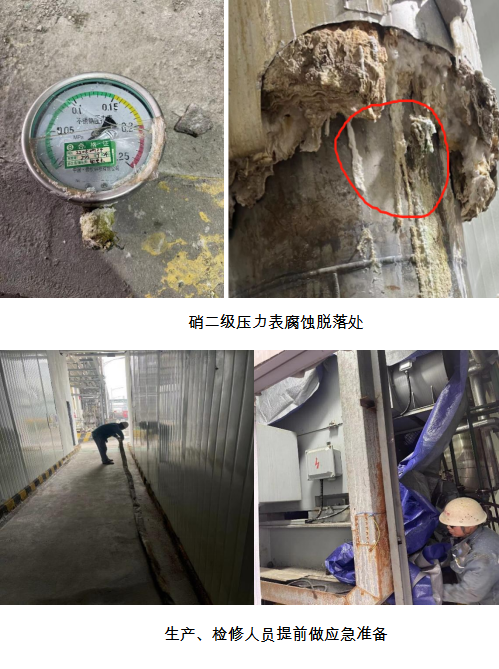 10:24蒸發(fā)濃縮附屬設(shè)施停下,硝二級(jí)開(kāi)始往清水箱排液,生產(chǎn)班組負(fù)責(zé)提前接好地坑潛水泵備用,電儀人員和生產(chǎn)崗位人員負(fù)責(zé)將篷布覆蓋壓縮機(jī)電機(jī),以防排液過(guò)程中出現(xiàn)泄漏導(dǎo)致電機(jī)進(jìn)水。陳江負(fù)責(zé)外圍公路雨篦子和區(qū)域地溝邊用消防沙圍堵,防止地坑翻液進(jìn)下水道,污染下游水質(zhì)。11:29分,硝二級(jí)在排液過(guò)程中壓力表頭子突然出現(xiàn)高濃縮液泄漏、噴濺,生產(chǎn)副部長(zhǎng)楊平組織檢修、電儀人員做好臨時(shí)遮擋,防止液體噴濺。12:17分硝二級(jí)高濃縮液順利排空,未造成人員傷害和設(shè)備損壞事故。12:28分電儀組唐亮對(duì)硝二級(jí)循環(huán)管腐蝕掉落的壓力表頭子進(jìn)行封堵,對(duì)未損壞的壓力表進(jìn)行更換。12:30分損壞壓力表更換完成,硝二級(jí)開(kāi)始注液試漏,為徹底消除潛在隱患,硝二級(jí)試漏完成,硝一級(jí)物料集中轉(zhuǎn)到硝二級(jí)。14:24硝一級(jí)物料打空,循環(huán)管相同點(diǎn)位壓力表進(jìn)行封堵、更換。15:56硝兩級(jí)蒸發(fā)器注液、升溫完畢,啟壓縮機(jī)恢復(fù)正常生產(chǎn)。
