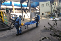5.31日上午10時生產(chǎn)部接到有限空間煤氣中毒事故報告,在燒結(jié)一期濕法由于煙道檢修,有一名工人煤氣中毒后暈倒。生產(chǎn)部馬上啟動應(yīng)急救援,10:10分兩名救援隊員攜帶擔(dān)架、急救藥箱、空氣呼吸機等器材進入演練場地,經(jīng)過現(xiàn)場查看,受傷人員輕度昏迷,救援隊員將受傷人員抬在擔(dān)架上,轉(zhuǎn)移至安全場所進行人工呼吸,10:20受傷人員恢復(fù)意識。