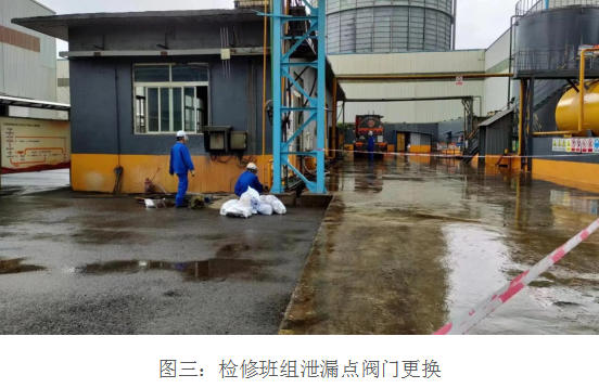 本次演練模擬硫酸卸車泵房硫酸管道泄漏,14:00當(dāng)班兩名酸堿工巡查酸堿管網(wǎng)時(shí)發(fā)現(xiàn)酸堿卸車區(qū)閥門滲漏;現(xiàn)場人員立即通知當(dāng)班班長,班長立即組織人員準(zhǔn)備急救物資;14:02當(dāng)班班長趕到現(xiàn)場查看滲漏情況后立即組織人員用應(yīng)急沙進(jìn)行圍堵并安排人員拉好警戒線維持好現(xiàn)場次序;14:03當(dāng)班班長將情況匯報(bào)調(diào)度室,同時(shí)通知檢修到場,調(diào)度室第一時(shí)間通知安全環(huán)?;14:05檢修到現(xiàn)場確認(rèn)情況,制定出檢修方案并開始檢修,同時(shí)現(xiàn)場監(jiān)護(hù)人員確認(rèn)檢修防護(hù)用品是否穿戴完整;14:15經(jīng)過檢修搶修后現(xiàn)場試車確認(rèn),無滲漏,匯報(bào)相關(guān)領(lǐng)導(dǎo)同時(shí)把地面污染物進(jìn)行清理;14:25經(jīng)過相關(guān)領(lǐng)導(dǎo)確認(rèn)后,無滲漏,同意恢復(fù)生產(chǎn);14:28匯報(bào)調(diào)度,調(diào)度室通知恢復(fù)正常生產(chǎn)。