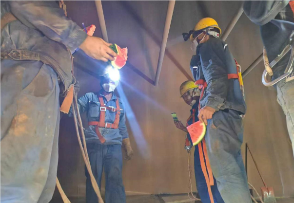 8月13日,球團(tuán)脫硫脫硝系統(tǒng)定期檢修,檢修工作地點多數(shù)在室外,高溫天氣和高強度工作量更是加大了人員中暑的風(fēng)險。下午4點氣溫達(dá)到了33度,后勤人員帶著切好的冰凍西瓜來到檢修現(xiàn)場,把清涼送到每個區(qū)域,也送到了39米高的濕電頂部。