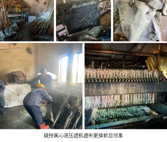 8月12日,威遠(yuǎn)澤天接手焦化脫硫廢液運(yùn)維項(xiàng)目?jī)H兩天,便發(fā)現(xiàn)系統(tǒng)內(nèi)廢液濃度較高,雜質(zhì)含量多。現(xiàn)有壓濾機(jī)的濾布因長(zhǎng)期受到物料的沖刷、腐蝕及頻繁的機(jī)械擠壓,已出現(xiàn)不同程度的磨損和堵塞,濾板也發(fā)生變形,導(dǎo)致過(guò)濾效果大幅下降,進(jìn)而引發(fā)管道堵塞,使生產(chǎn)無(wú)法正常運(yùn)行。為確保焦化脫硫廢液系統(tǒng)的高效穩(wěn)定運(yùn)行,威遠(yuǎn)澤天生產(chǎn)部迅速對(duì)焦化硫酸銨離心液壓濾機(jī)的濾布進(jìn)行了全面更換。
